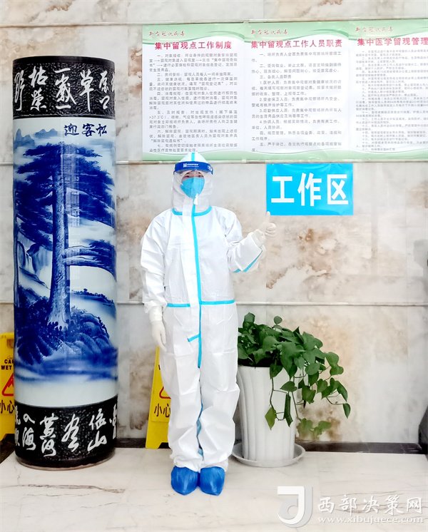 每天,她和隊(duì)員們穿著防護(hù)服24小時(shí)為隔離群眾掃碼、檢測(cè)體溫、遞送三餐、詢問留觀人員狀況、規(guī)范醫(yī)療廢棄物處置。夜深人靜時(shí),在賓館大廳和走廊間,時(shí)??梢钥匆娝β刀謭?jiān)定的背影。