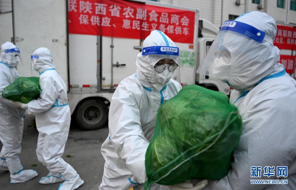 1月2日,西安醫(yī)學(xué)院的學(xué)生志愿者在搬運物資。當(dāng)日,陜西省農(nóng)副食品商會向西安醫(yī)學(xué)院捐贈價值40余萬元的愛心蔬菜、食品物資、生活物資。