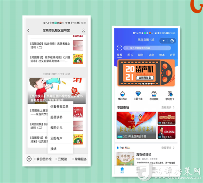 閉館不閉網(wǎng),線上服務(wù)不打烊。自12月23日閉館以來,區(qū)圖書館整合各類數(shù)字資源,免費提供豐富的線上服務(wù),滿足不同年齡群體讀者的閱讀需求,更新“超星閱讀”APP,電子書、數(shù)字期刊、講座、繪本、聽書等海量資源為讀者提供高質(zhì)量的閱讀福利。利用“陜西數(shù)字文化網(wǎng)”“鳳翔區(qū)圖書館官方網(wǎng)站”“鳳翔區(qū)圖書館”公眾微信號,線上開設(shè)【鳳圖戰(zhàn)疫】【鳳圖薦讀】【紅色故事繪】【館員姐姐講故事】【館員有聲薦讀】【鳳圖文苑】等閱讀服務(wù)專欄,提供疫情防控知識、繪本閱讀、親子故事講讀、線上展覽等,讀者通過關(guān)注“寶雞市鳳翔區(qū)圖書館”公眾號、網(wǎng)站享受24小時線上服務(wù),通過鳳翔區(qū)圖書館總分館群,將這些優(yōu)質(zhì)數(shù)字資源向基層分館輸送,讓廣大讀者暢享“云端閱讀”。