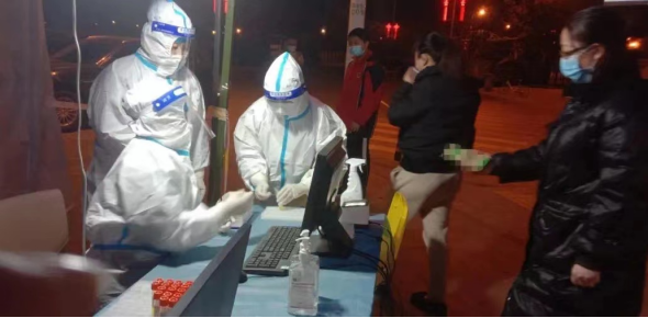 經(jīng)過星夜兼程,連夜入住酒店,開展各種培訓(xùn)、考核,為釆樣工作積極準(zhǔn)備著。12月19日,寶雞采樣隊接到的任務(wù)是支援浐灞金融園區(qū)全員的核酸釆樣工作。金融園區(qū)有將近9萬人 ,由于人口眾多,核酸釆集工作量大,時間要求緊迫,為了在規(guī)定時間內(nèi)完成釆樣任務(wù),寶雞采樣隊的隊員早出晚歸,每天休息時間很短暫,實在太累,常常在吃飯時打個盹。冬日的西安,寒風(fēng)凜冽,殘雪未消,嚴(yán)峻的疫情形勢,絲毫沒有嚇倒可愛的隊員們,反而更加喚起大家的熱血斗志。西安的夜晚很冷,零下6-7℃更是常態(tài),隊員們從不怕冷,更不叫苦,依然堅守在凌冽的寒風(fēng)中,在崗位上一干就是數(shù)個小時,任務(wù)集中的時候,大家顧不上吃飯 ,穿著厚重的防護(hù)服 ,全副武裝 ,連呼吸都很困難。數(shù)個小時的連續(xù)做戰(zhàn),每個人都腰酸背痛,防護(hù)面屏上更是結(jié)起了一層薄冰 ,隊員們的手指被凍得腫脹通紅,冰冷的消毒水一遍遍刺激著隊員們的末梢神經(jīng),但這絲毫沒有影響他們工作的熱情 ,沒有一個人退縮,太冷了他們就在原地跺跺腳,大家相互加油打氣,只為凌晨的堅守和不忘初心的使命!隊員們耐心地囑咐大家張開嘴巴,發(fā)出“啊”的聲音 ,一個,兩個,三個……這樣的動作,重復(fù)了一遍又一遍。碰到年齡較小的幼童,核酸采樣人員更是顧不得地面冰涼,單膝跪地完成采樣。