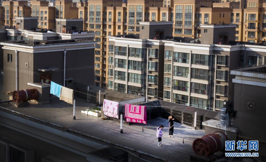 1月14日,西安市一小區(qū)居民在樓頂上跳繩鍛煉(無人機(jī)照片)。新華社記者 陶明 攝