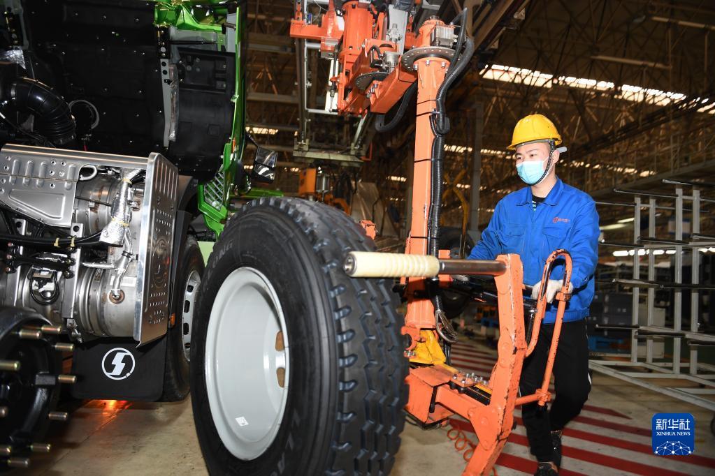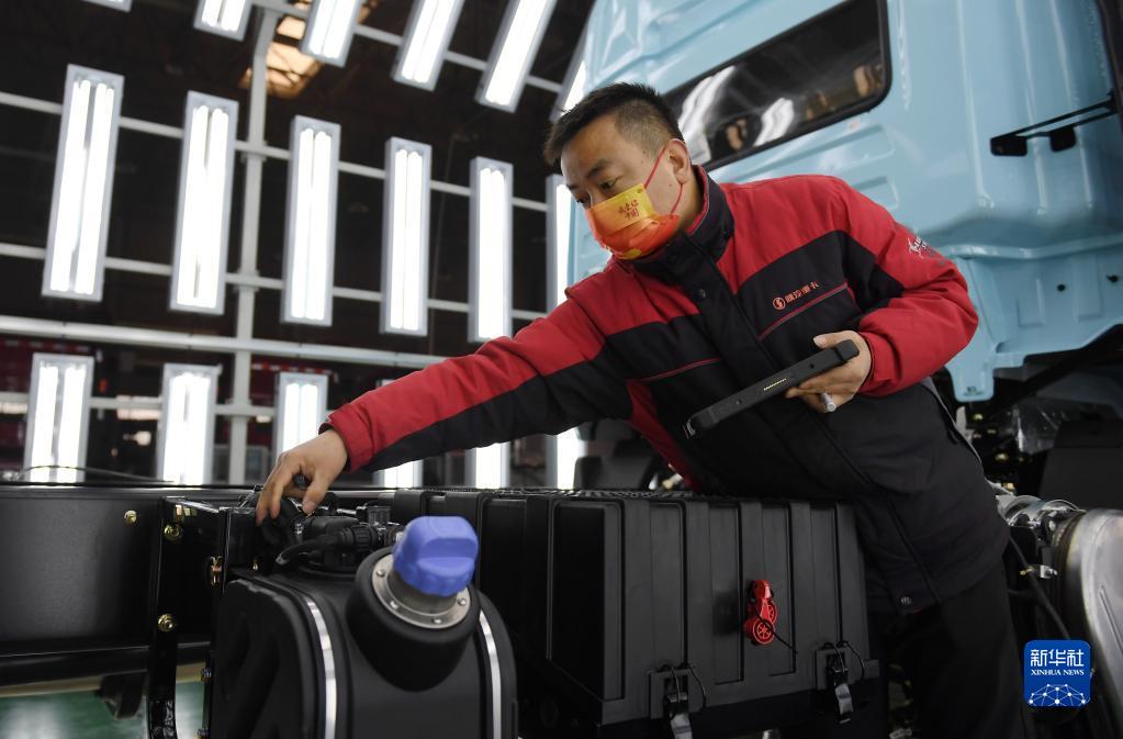 1月20日,工作人員在陜西汽車控股集團(tuán)有限公司總裝車間進(jìn)行重型卡車驗收。新華社記者 李一博 攝