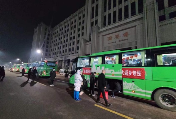 為了保障將創(chuàng)新港學生閉環(huán)轉運至西安“兩站一場”,灃西新城對接西咸公交集團,協(xié)調了50輛公交車、大巴車,根據(jù)學生訂票時間制定班次,全程參與暖心返鄉(xiāng)行動,24小時不停歇,點對點將學生運送至“兩站一場”。