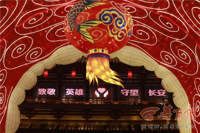 在雁南一路口設(shè)置了“致敬英雄 守望長安”燈組。宋立嬌介紹,設(shè)計(jì)這組燈是為了向抗疫英雄致敬,并鼓舞全市人民抗疫士氣。雁南一路以南水池上“百鳥朝鳳”燈組,以鳳凰、牡丹、百鳥為主題,打造百鳥朝鳳氛圍裝置,體現(xiàn)出一切生機(jī)勃勃,美好時(shí)光來臨,看到了一片美好的前景。