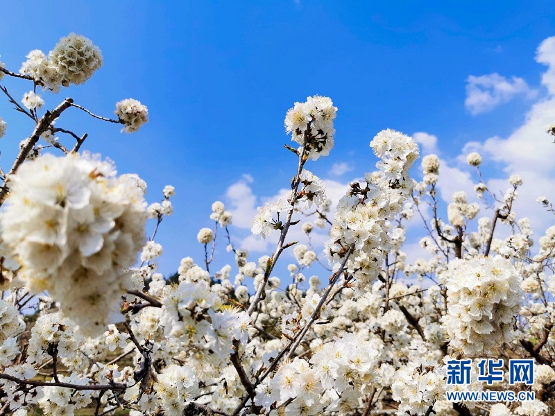 圖為湖北來鳳縣百福司鎮(zhèn)可洞村的櫻桃花迎風(fēng)搖曳,除了具有觀賞價值,4月底,游客還可前來體驗采摘樂趣。