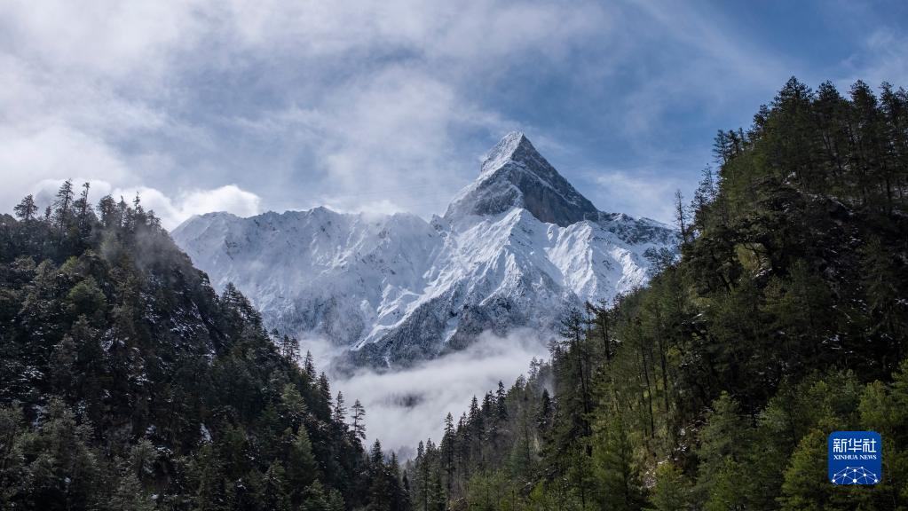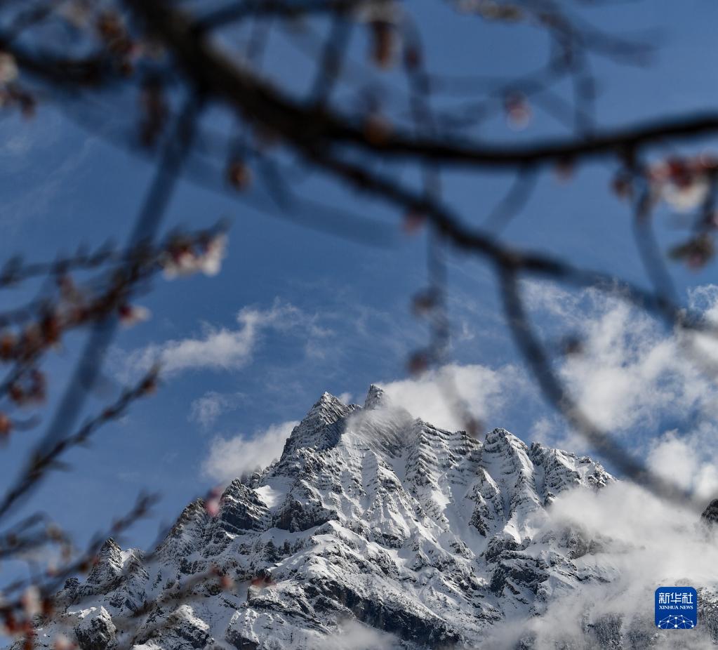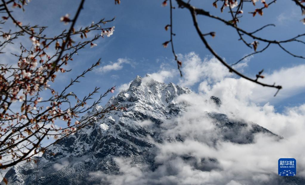 這是在波密縣拍攝的桃花掩映下的雪山(4月18日攝)。新華社記者 晉美多吉 攝