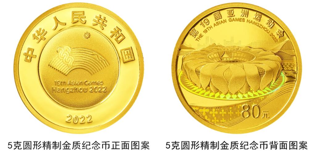 該套金銀紀(jì)念幣正面圖案均為第19屆亞洲運(yùn)動(dòng)會(huì)會(huì)徽,并刊國(guó)名、年號(hào)。5克圓形金質(zhì)紀(jì)念幣背面圖案為杭州奧林匹克體育中心體育場(chǎng),輔以城市建筑、山水、桂花等元素裝飾組合設(shè)計(jì),并刊“第19屆亞洲運(yùn)動(dòng)會(huì)”等字樣。該紀(jì)念幣含純金5克,最大發(fā)行量1萬枚。