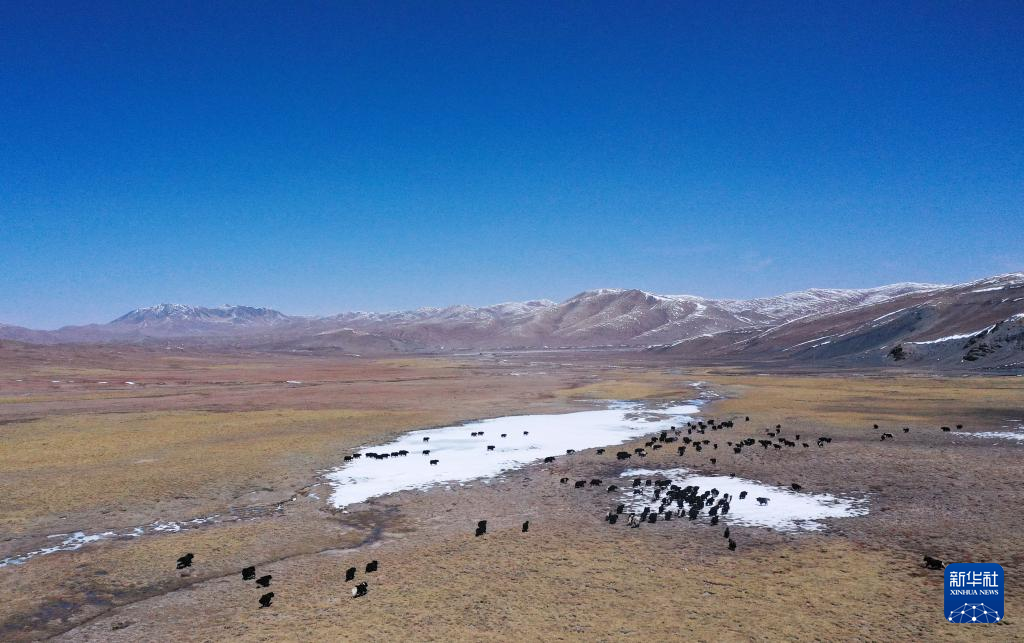 4月19日,在青海省玉樹藏族自治州曲麻萊縣,牦牛在草原上覓食(無人機(jī)照片)。