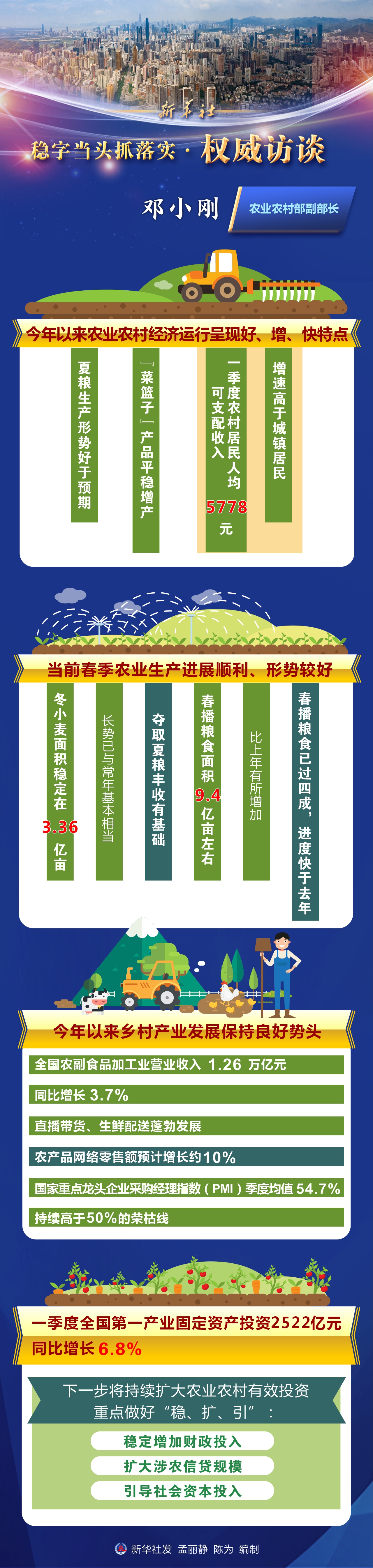 農(nóng)業(yè)農(nóng)村經(jīng)濟(jì)運(yùn)行呈現(xiàn)好、增、快的特點(diǎn):夏糧生產(chǎn)形勢好于預(yù)期,“菜籃子”產(chǎn)品平穩(wěn)增產(chǎn),一季度農(nóng)村居民人均可支配收入5778元,增速高于城鎮(zhèn)居民,脫貧地區(qū)農(nóng)民收入增速繼續(xù)快于全國農(nóng)村平均水平。下一步,我們將扎實(shí)推進(jìn)鄉(xiāng)村振興各項(xiàng)重點(diǎn)任務(wù),為經(jīng)濟(jì)社會大局穩(wěn)定提供堅(jiān)實(shí)支撐。