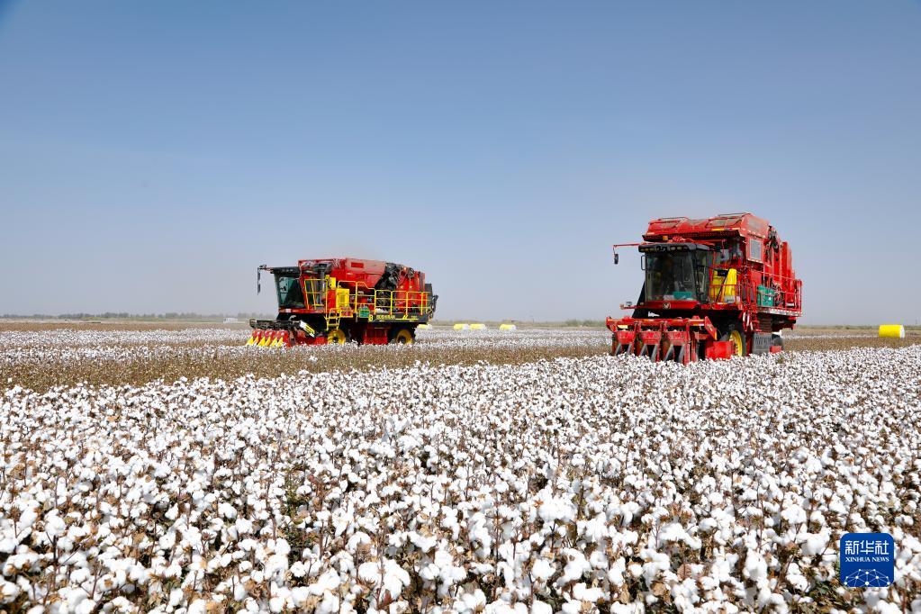 在新疆巴音郭楞蒙古自治州尉犁縣興平鎮(zhèn)統(tǒng)其克村,兩臺國產采棉機在采收棉花(2022年9月30日攝)。新華社發(fā)(汪志鵬 攝)
