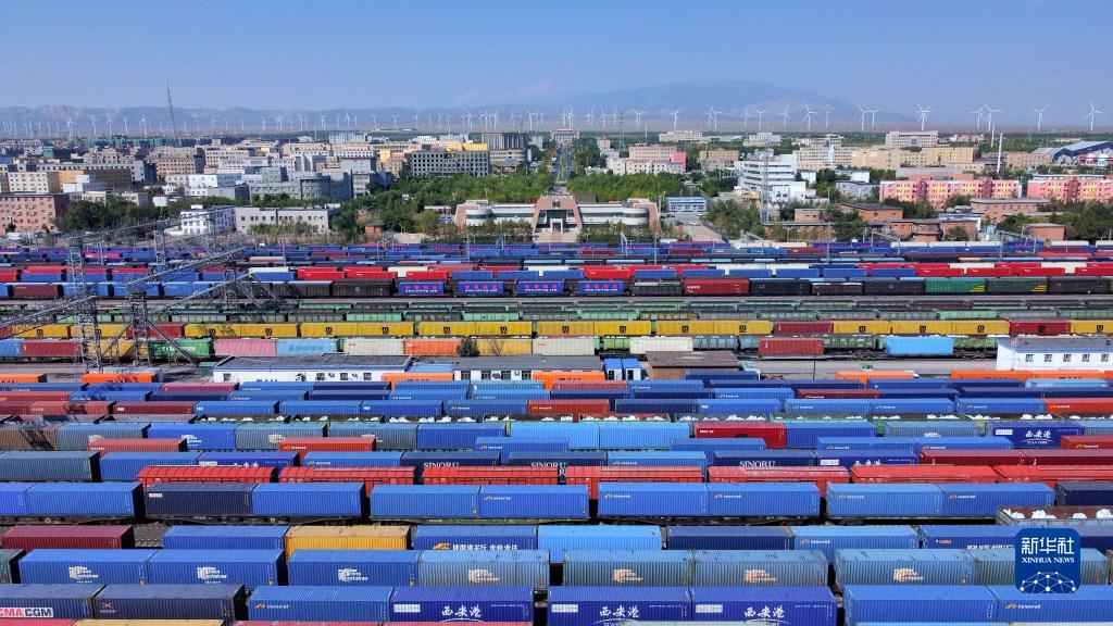 在新疆阿拉山口站寬準軌編組場,出入境中歐班列集結等待出發(fā)(2022年9月10日攝,無人機照片)。新華社發(fā)(陳乾 攝)