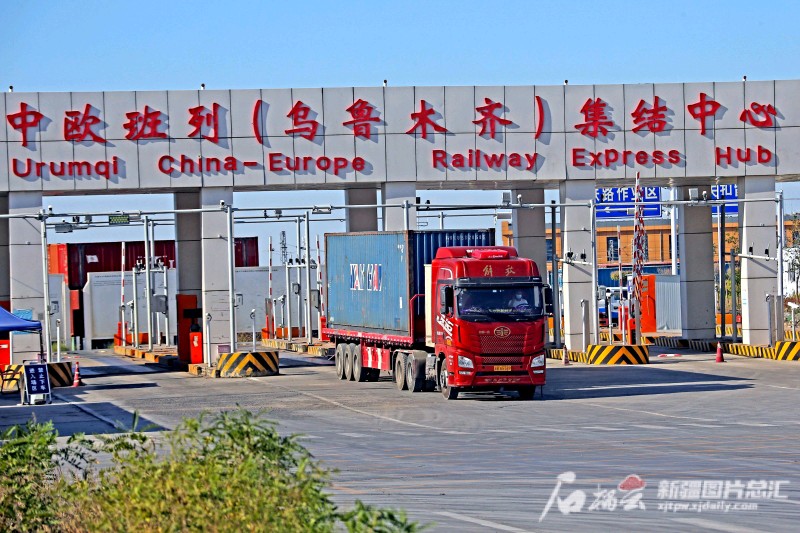 7月14日,一臺卡車從烏魯木齊國際陸港區(qū)中歐班列(烏魯木齊)集結中心駛出(資料圖片)。 石榴云/新疆日報記者 蔡增樂攝