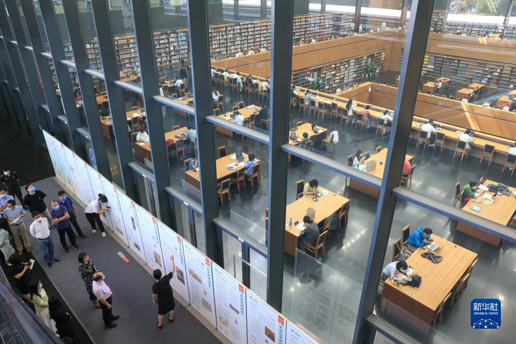 在北京國(guó)家圖書(shū)館,工作人員介紹“經(jīng)典,予生活以詩(shī)意——‘文津經(jīng)典誦讀’十周年主題展”(2022年9月7日攝)。新華社記者 殷剛 攝