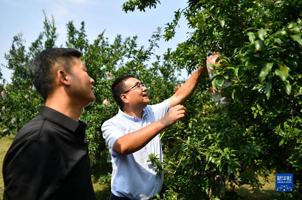 陜西省西安市臨潼區(qū)園藝工作站工作人員(右)與當(dāng)?shù)厥穹N植大戶(hù)交流果品長(zhǎng)勢(shì)(2022年9月26日攝)。新華社記者 張博文 攝