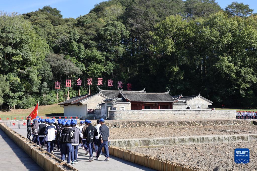 10月19日,在福建省上杭縣古田鎮(zhèn),中學(xué)生研學(xué)團(tuán)隊(duì)在古田會議會址參觀學(xué)習(xí)。新華社發(fā)(范道鑫 攝)