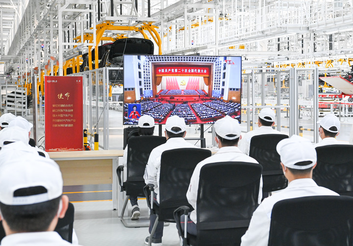 10月16日,在吉林省長春市中國第一汽車集團(tuán)有限公司紅旗繁榮工廠,職工在收看中國共產(chǎn)黨第二十次全國代表大會(huì)開幕會(huì)。新華社記者 顏麟蘊(yùn) 攝