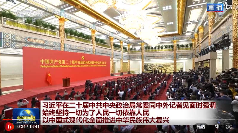 剛剛在中國共產黨第二十屆中央委員會第一次全體會議上當選的中共中央總書記習近平和中共中央政治局常委李強、趙樂際、王滬寧、蔡奇、丁薛祥、李希,23日中午在人民大會堂同采訪中共二十大的中外記者親切見面。