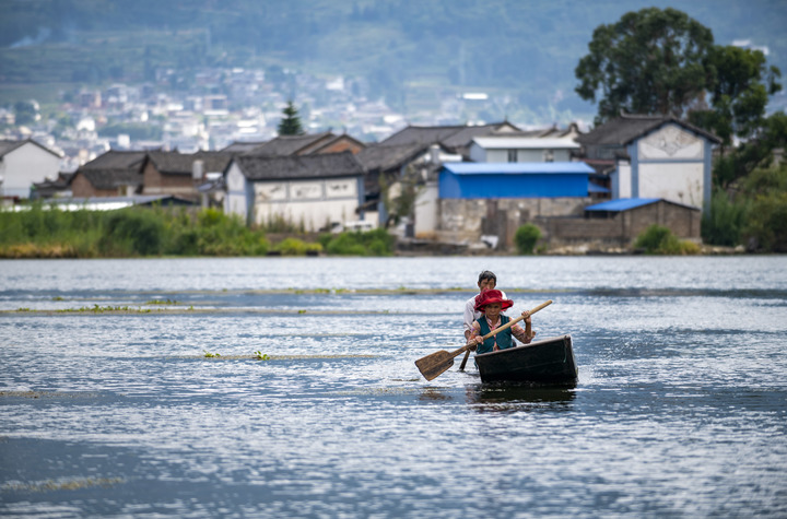 9月28日,洱源西湖當?shù)卮迕駝澊鲂?。新華社記者 陳欣波 攝
