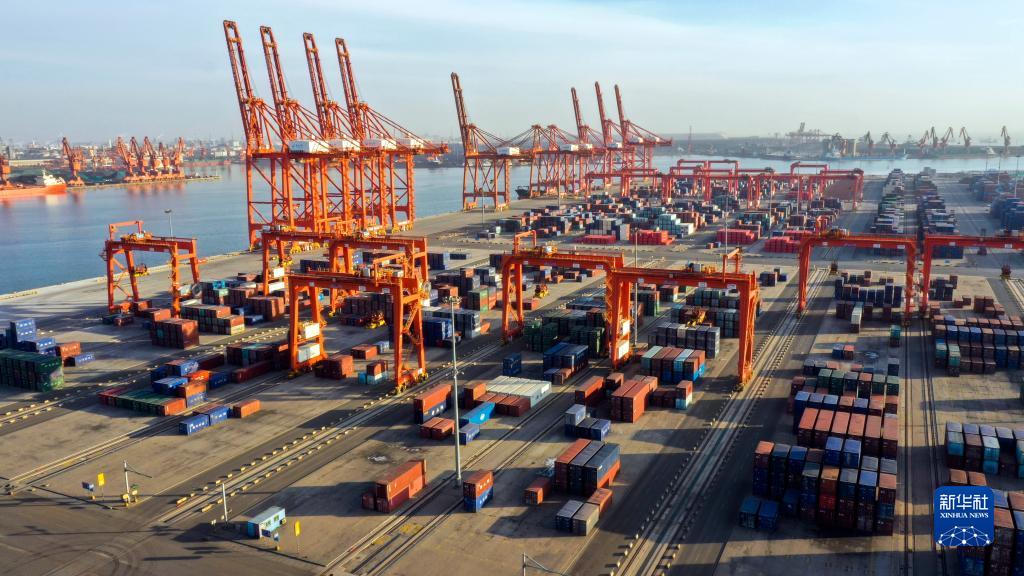 12月7日拍攝的唐山港京唐港區(qū)集裝箱碼頭一角(無(wú)人機(jī)照片)。新華社發(fā)(李磊 攝)