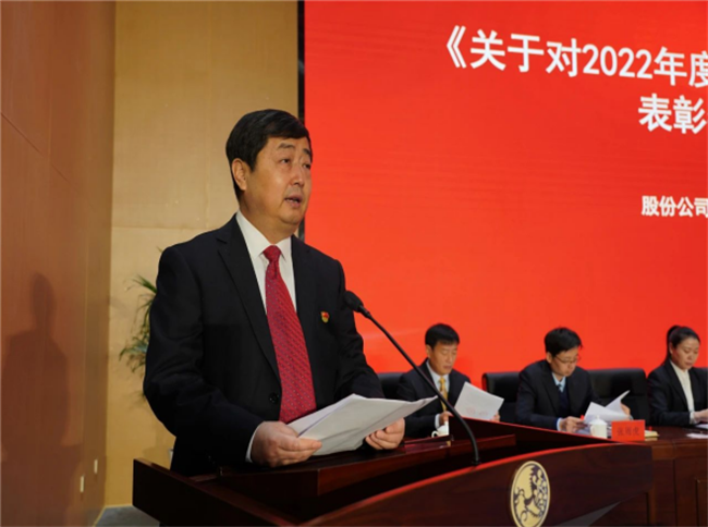 西鳳集團(tuán)公司黨委副書記郭拴新宣讀《關(guān)于命名表彰公司2022年度文明單位、文明班組、文明家庭和文明宿舍的決定》
