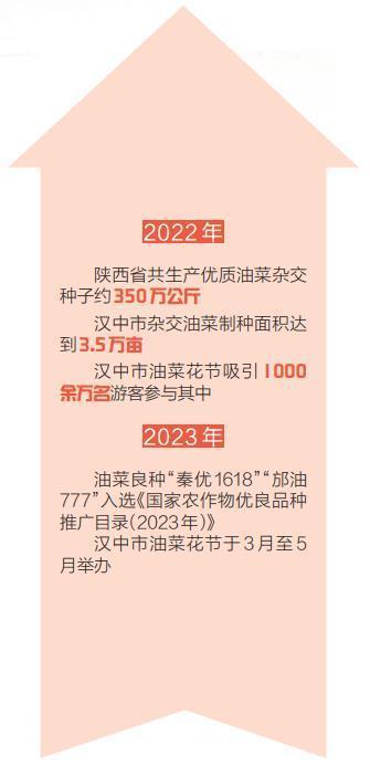 陜西是雜交油菜種業(yè)強(qiáng)省,雜交油菜育種研究和產(chǎn)業(yè)化開發(fā)一直走在全國前列。2022年,陜西省制定《油菜產(chǎn)業(yè)綠色革命科技三年行動實施方案》,取得明顯成效。陜西省去年全年共生產(chǎn)優(yōu)質(zhì)油菜雜交種子約350萬公斤。勉縣、城固縣、洋縣入選全國油菜產(chǎn)業(yè)綠色革命科技示范縣;陜西農(nóng)業(yè)科研單位培育的油菜良種“秦優(yōu)1618”“邡油777”入選2022年國家糧油生產(chǎn)主導(dǎo)品種和《國家農(nóng)作物優(yōu)良品種推廣目錄(2023年)》;漢中市農(nóng)業(yè)農(nóng)村局啟動糧油“百千萬”豐產(chǎn)示范工程,在全市11個縣(區(qū))建立油菜優(yōu)良品種和綠色高產(chǎn)高效生產(chǎn)技術(shù)百畝示范點56個8100畝、千畝示范片23個2.9萬畝、萬畝示范帶9個10.5萬畝;漢中市南鄭區(qū)和勉縣被農(nóng)業(yè)農(nóng)村部認(rèn)定為國家級油菜制種大縣。漢中市委、市政府提出“最強(qiáng)產(chǎn)業(yè)、最優(yōu)種業(yè)、最美花海”的發(fā)展戰(zhàn)略,以“花”為媒,將漢中市油菜花節(jié)打造成推動鄉(xiāng)村振興和發(fā)展文化旅游的重要載體。2022年,1000余萬名游客前來觀光旅游或參與線上活動。“油菜經(jīng)濟(jì)”堪稱陜西的一張金色名片。