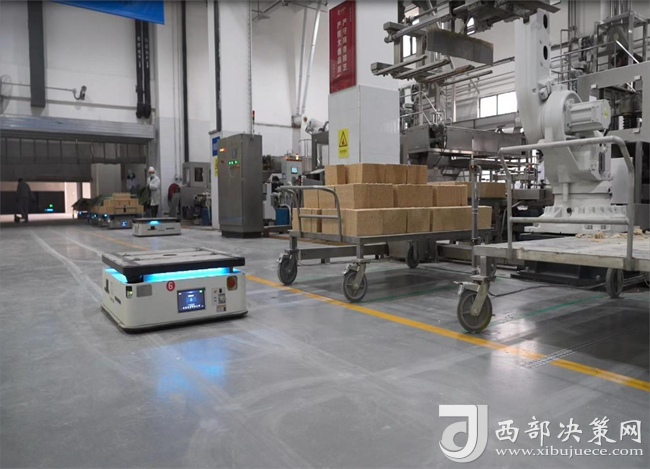 “駛?cè)?、頂起、旋轉(zhuǎn)、前進……”一走進西鳳酒智能化技改701制曲車間,記者就看到一個個散發(fā)著科技光輝的“板車寶寶”穿梭在車間的運輸通道上,有條不紊地進行著曲塊運輸工作。