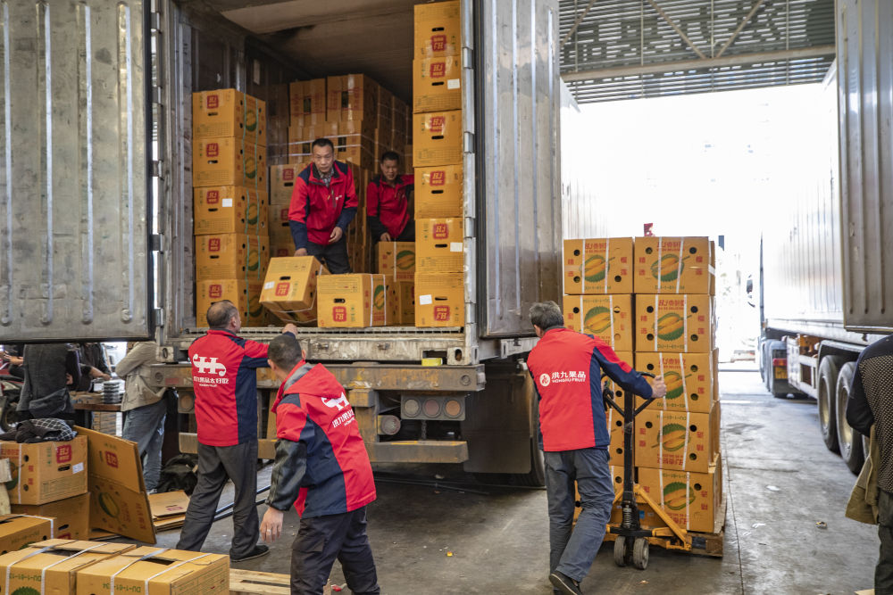 在重慶市江津區(qū)雙福農(nóng)貿(mào)城,洪九果品的工作人員在搬運(yùn)從泰國運(yùn)輸過來的榴蓮(2022年4月19日攝)。新華社記者 黃偉 攝