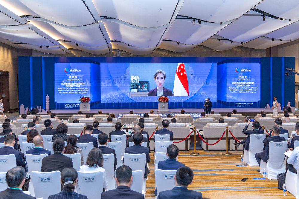 2023年4月20日,在重慶市第五屆中新(重慶)戰(zhàn)略性互聯(lián)互通示范項目金融峰會開幕式現(xiàn)場,新加坡通訊及新聞部部長、內(nèi)政部第二部長楊莉明線上致辭。新華社記者 黃偉 攝