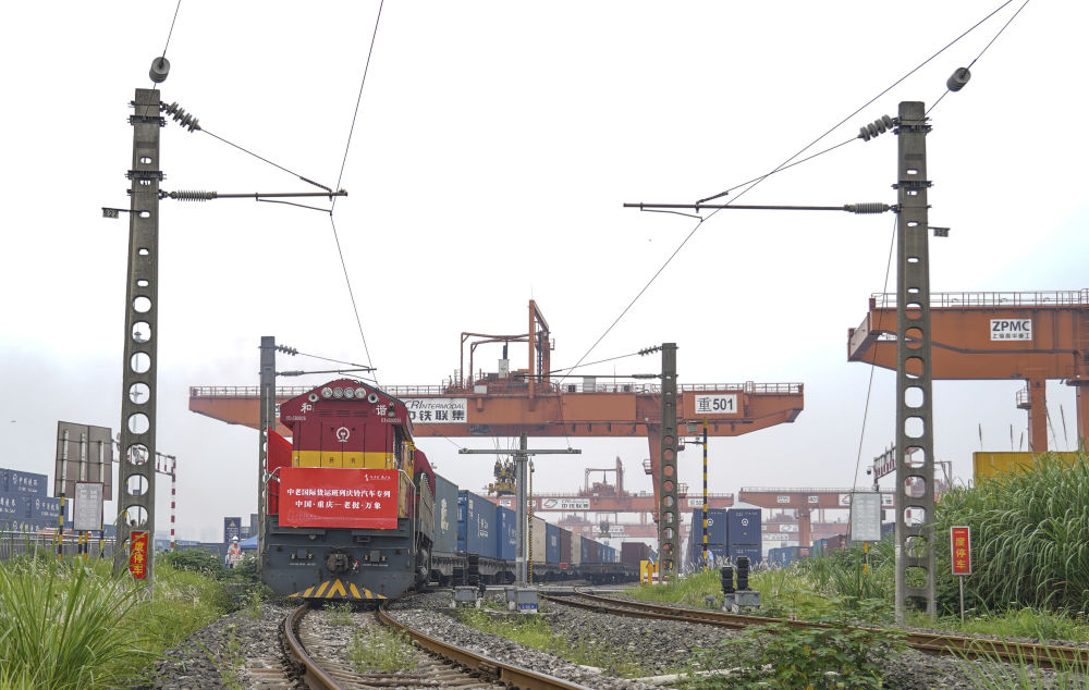 中老國際貨運(yùn)班列慶鈴汽車專列從重慶團(tuán)結(jié)村車站駛出(2022年6月8日攝)。新華社記者 黃偉 攝