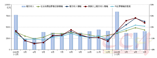 國家統(tǒng)計(jì)局6月15日發(fā)布的5月份國民經(jīng)濟(jì)運(yùn)行數(shù)據(jù)顯示,2023年5月份,全國餐飲收入4070億元,同比上升35.1%;限額以上單位餐飲收入1084億元,同比上升31.4%。2023年1-5月,全國餐飲收入19958億元,同比上升22.6%;限額以上單位餐飲收入5086億元,同比上升25.4%。