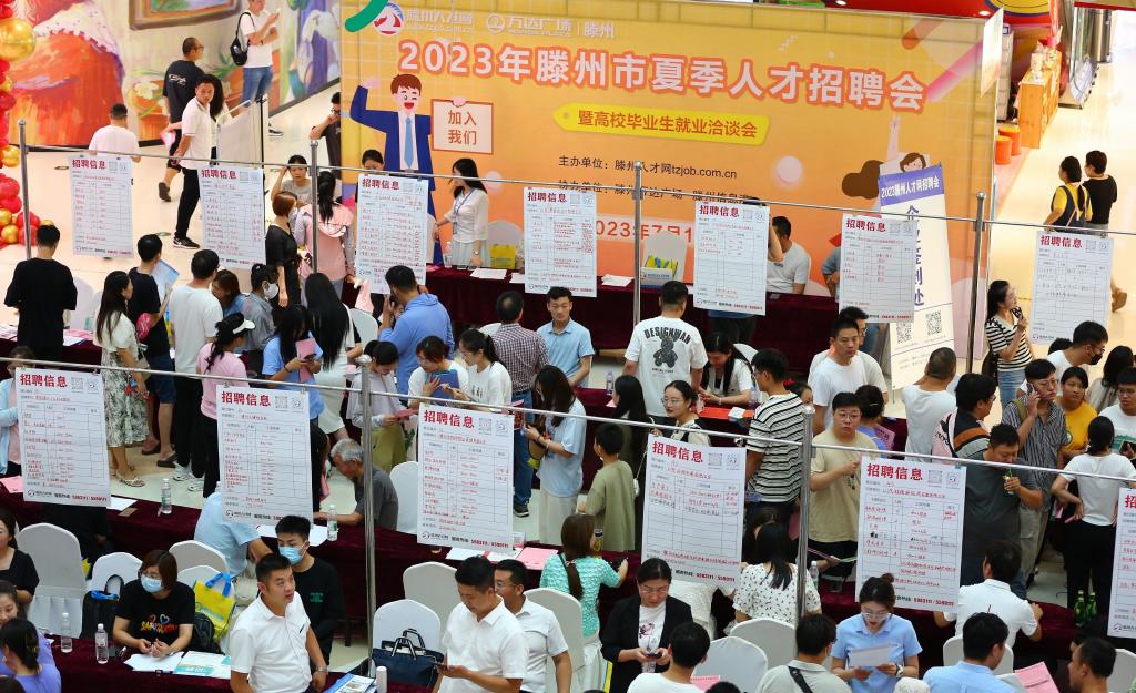 2023年7月15日,求職者在山東省滕州市舉行的夏季人才招聘會暨高校畢業(yè)生就業(yè)洽談會上了解崗位信息。新華社發(fā)(李志軍 攝)