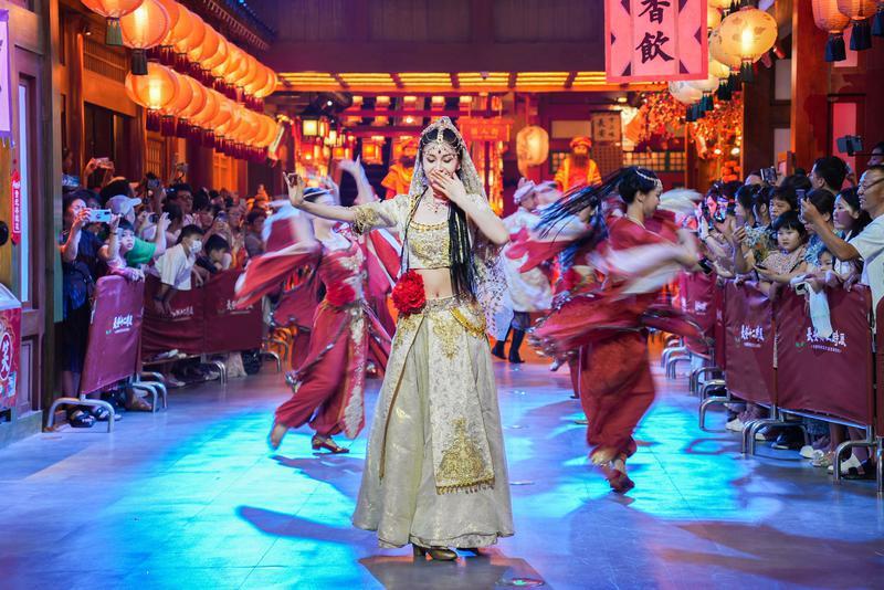 精彩的舞蹈吸引了游客的目光,將他們帶回盛唐街頭。