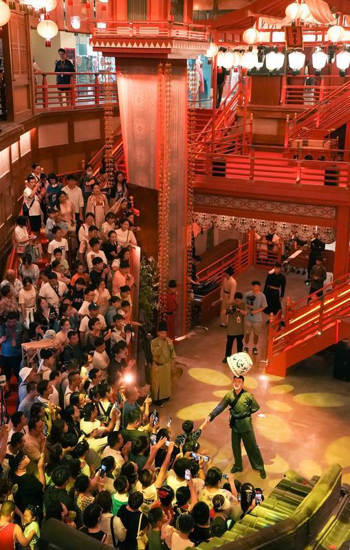 雜耍表演《長(zhǎng)安百藝》演員與游客互動(dòng)。