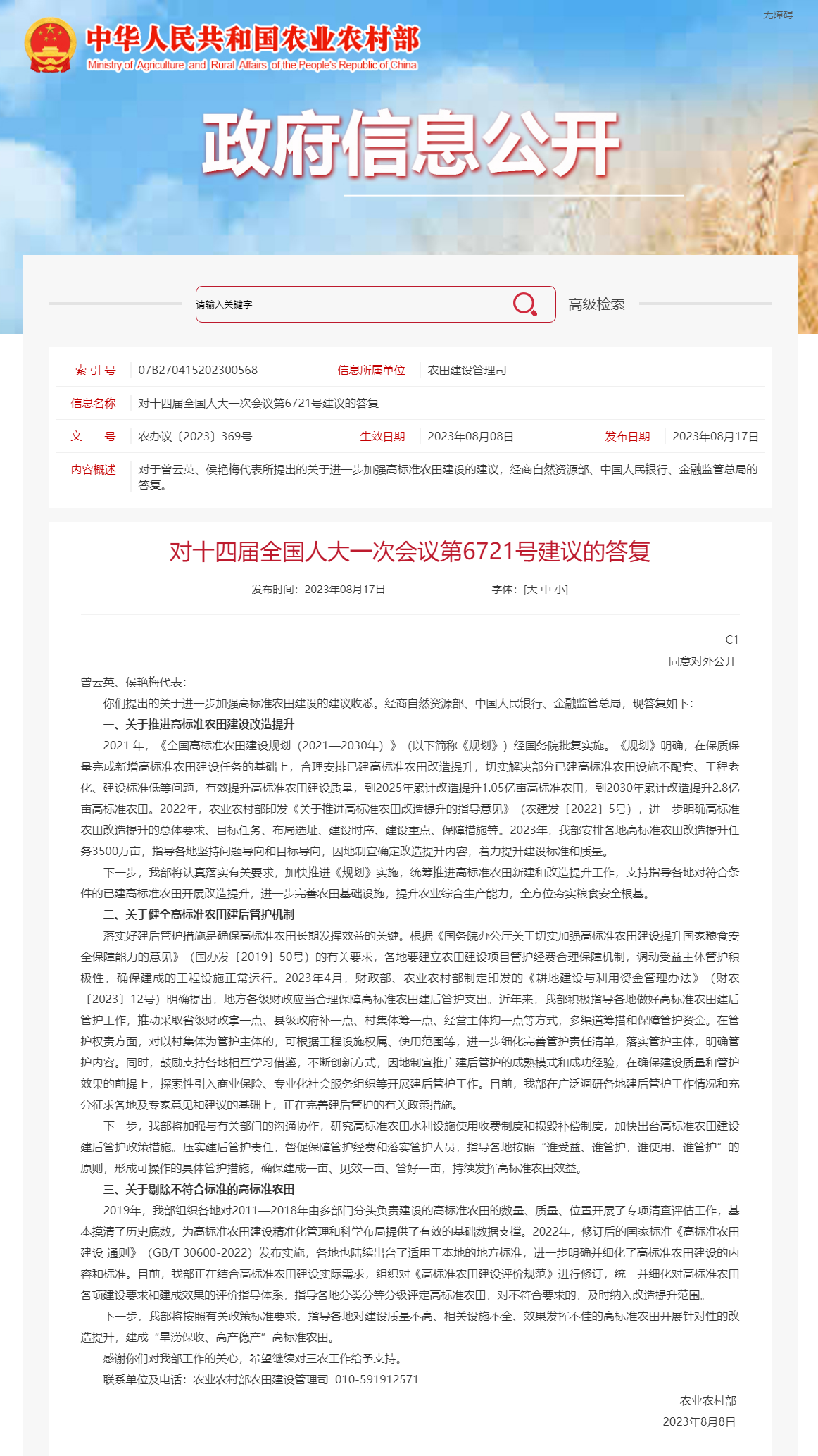 央視網(wǎng)消息:8月17日,農(nóng)業(yè)農(nóng)村部公布對十四屆全國人大一次會(huì)議第6721號建議的答復(fù)。其中提出,下一步,農(nóng)業(yè)農(nóng)村部將加強(qiáng)與有關(guān)部門的溝通協(xié)作,研究高標(biāo)準(zhǔn)農(nóng)田水利設(shè)施使用收費(fèi)制度和損毀補(bǔ)償制度,加快出臺(tái)高標(biāo)準(zhǔn)農(nóng)田建設(shè)建后管護(hù)政策措施。壓實(shí)建后管護(hù)責(zé)任,督促保障管護(hù)經(jīng)費(fèi)和落實(shí)管護(hù)人員,指導(dǎo)各地按照“誰受益、誰管護(hù),誰使用、誰管護(hù)”的原則,形成可操作的具體管護(hù)措施,確保建成一畝、見效一畝、管好一畝,持續(xù)發(fā)揮高標(biāo)準(zhǔn)農(nóng)田效益。