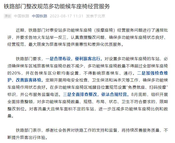 鐵路部門要求,一是合理布設(shè),便利旅客出行。對(duì)設(shè)置多功能候車座椅的車站,必須確保候車區(qū)域旅客候車座椅總數(shù)不減少,多功能候車座椅數(shù)量不得超過(guò)全部候車座椅的20%,并在各候車區(qū)分散均衡設(shè)置,不得影響旅客候車、通行。二是加強(qiáng)檢查維護(hù),改善旅客體驗(yàn)。定期開展用電安全檢查、衛(wèi)生保潔和消殺滅等工作,確保多功能候車座椅作用狀態(tài)良好。在多功能候車座椅區(qū)域醒目位置規(guī)范設(shè)置“免費(fèi)就座、掃碼按摩”標(biāo)識(shí),并公布服務(wù)監(jiān)督電話。三是全面排查整改,依法合規(guī)經(jīng)營(yíng)。8月底前,組織開展全面排查整頓,對(duì)多功能候車座椅數(shù)量、規(guī)格、布局、狀態(tài)、衛(wèi)生不符合要求的,限期整改到位。對(duì)客流量大且候車面積不足的車站,進(jìn)一步壓減多功能候車座椅比例和數(shù)量。