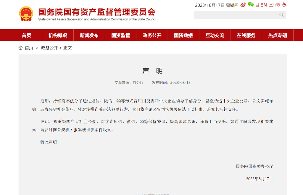 國務(wù)院國資委辦公廳8月17日在國務(wù)院國資委官網(wǎng)發(fā)布聲明稱,近期,持續(xù)有不法分子通過短信、微信、QQ等形式冒用國務(wù)院國資委和中央企業(yè)領(lǐng)導(dǎo)干部身份,甚至偽造中央企業(yè)公章、公文實施詐騙,造成惡劣社會影響。針對涉嫌詐騙違法犯罪行為,國務(wù)院國資委將商請公安司法機關(guān)依法予以打擊,追究其法律責(zé)任。