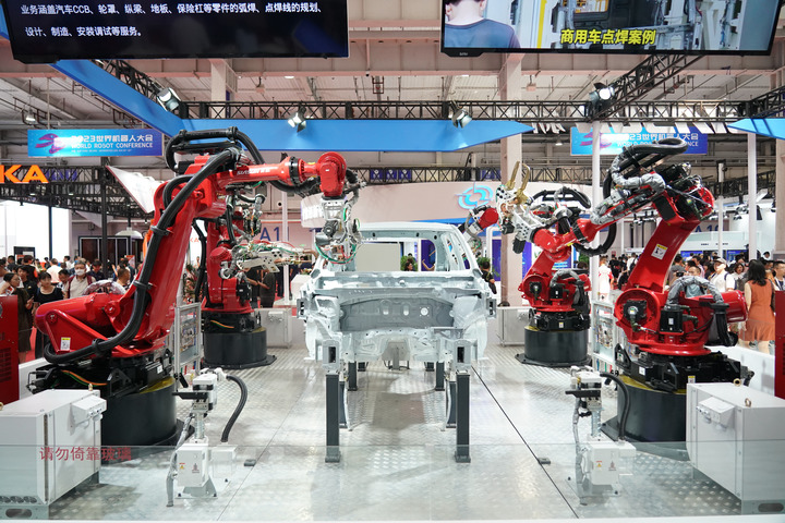 這是8月17日在2023世界機(jī)器人大會(huì)現(xiàn)場(chǎng)拍攝的白車身焊點(diǎn)機(jī)器人工作站。 新華社記者 張晨霖 攝