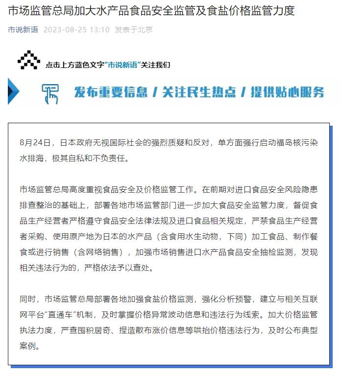 市場監(jiān)管總局高度重視食品安全及價格監(jiān)管工作。在前期對進口食品安全風險隱患排查整治的基礎上,部署各地市場監(jiān)管部門進一步加大食品安全監(jiān)管力度,督促食品生產經營者嚴格遵守食品安全法律法規(guī)及進口食品相關規(guī)定,嚴禁食品生產經營者采購、使用原產地為日本的水產品(含食用水生動物,下同)加工食品、制作餐食或進行銷售(含網絡銷售),加強市場銷售進口水產品食品安全抽檢監(jiān)測,發(fā)現(xiàn)相關違法行為的,嚴格依法予以查處。