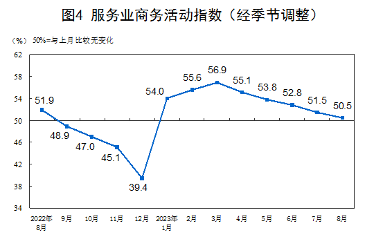 8月份,非制造業(yè)商務(wù)活動(dòng)指數(shù)為51.0%,比上月下降0.5個(gè)百分點(diǎn),仍高于臨界點(diǎn),非制造業(yè)持續(xù)擴(kuò)張。