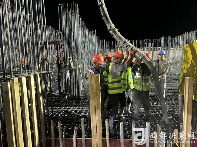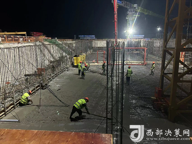 九層之臺,始于壘土。筏板作為基礎(chǔ)工程最重要的組成部分,其質(zhì)量的好壞直接影響到上部結(jié)構(gòu)的穩(wěn)固性。在完成筏板鋼筋綁扎后,2臺長臂泵車、34輛混凝土罐車開始送料。澆筑期間,映入眼簾的是一片繁忙之景,22名管理人員,110余名勞務(wù)人員正以時(shí)不我待的緊迫感,全力以赴抓緊抓實(shí)項(xiàng)目建設(shè),共同助力項(xiàng)目建設(shè)跑出加速度。