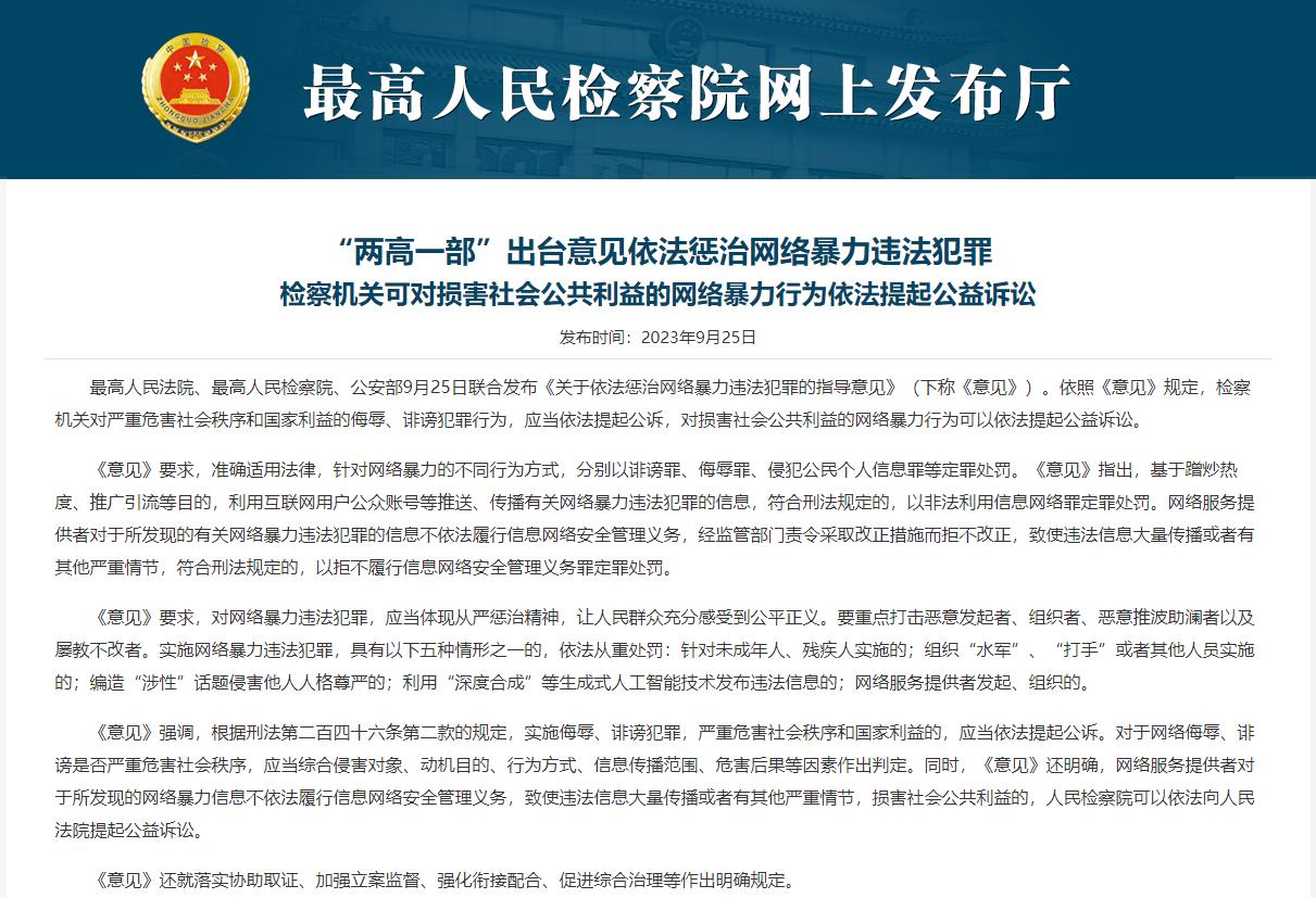 最高人民法院、最高人民檢察院、公安部9月25日聯(lián)合發(fā)布《關(guān)于依法懲治網(wǎng)絡(luò)暴力違法犯罪的指導(dǎo)意見》(下稱《意見》)。依照《意見》規(guī)定,檢察機(jī)關(guān)對(duì)嚴(yán)重危害社會(huì)秩序和國(guó)家利益的侮辱、誹謗犯罪行為,應(yīng)當(dāng)依法提起公訴,對(duì)損害社會(huì)公共利益的網(wǎng)絡(luò)暴力行為可以依法提起公益訴訟。