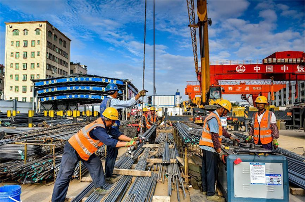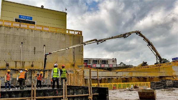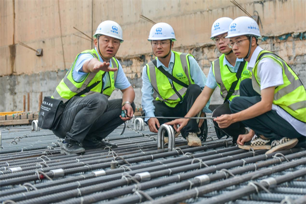 照此安排,項(xiàng)目部各部門、作業(yè)隊(duì)既各自為戰(zhàn),又協(xié)調(diào)統(tǒng)一,按區(qū)域、分專業(yè)、依先后齊頭并進(jìn)。筆者在地面施工區(qū)域看到,盾構(gòu)井臨時(shí)封堵板的鋼筋綁扎已經(jīng)完成,8名作業(yè)人員和監(jiān)理、技術(shù)人員在做最后的檢查,混凝土罐車、泵車嚴(yán)陣以待……不一會(huì)兒,混凝土順著管子就流向了鋼筋網(wǎng)內(nèi),4名振搗工也隨之開始忙碌,嗡嗡聲響成一片。車站1號(hào)鋼筋場(chǎng),10幾名穿著印有“鋼筋工”“信號(hào)司索工”馬甲的工人,或協(xié)助吊車調(diào)運(yùn)鋼筋、或切割鋼筋原材下料;不遠(yuǎn)處,吊車調(diào)運(yùn)明挖段鋼支撐轉(zhuǎn)場(chǎng)……