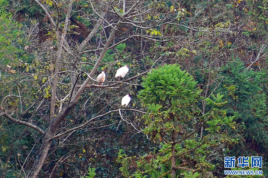 冬日,在石泉縣城關鎮(zhèn)絲銀壩村草池灣,3只朱鹮在樹上小憩。新華網(wǎng) 楊喜龍 攝
