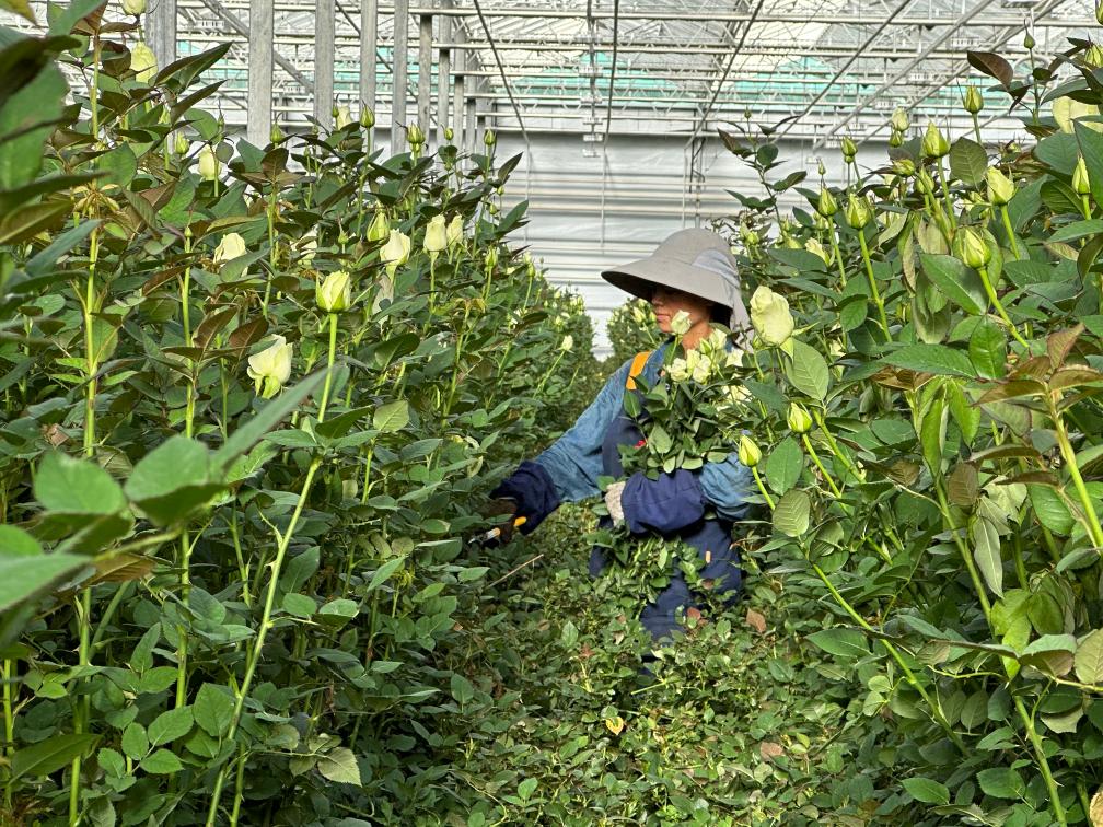 脫去厚重的外套,張小紅換上輕便的工作服,戴好手套和帽子,拿起大剪刀,開始了一天的剪花工作。只見她走進(jìn)幽深窄密的綠色長廊,直到看不見人影。少許時(shí)刻,她便抱著一大捧玫瑰走了出來,新鮮的露水從嬌嫩的花瓣上滴落。平板車?yán)锸M清水,她和其他工人們一起,將新鮮采摘的玫瑰用網(wǎng)紗細(xì)心地裹好,然后放置水中。再過不久,這些玫瑰將被運(yùn)往全國各地甚至海外,為人們帶來愉悅和享受。