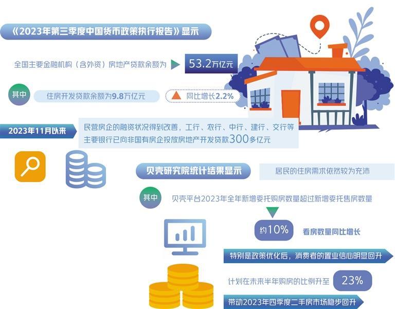 從銀行信貸角度看,房地產(chǎn)信貸融資的規(guī)模、結(jié)構(gòu)整體穩(wěn)定。《2023年第三季度中國(guó)貨幣政策執(zhí)行報(bào)告》顯示,全國(guó)主要金融機(jī)構(gòu)(含外資)房地產(chǎn)貸款余額為53.2萬(wàn)億元,其中,住房開發(fā)貸款余額為9.8萬(wàn)億元,同比增長(zhǎng)2.2%。2023年11月以來,民營(yíng)房企的融資狀況得到改善,工行、農(nóng)行、中行、建行、交行等主要銀行已向非國(guó)有房企投放房地產(chǎn)開發(fā)貸款300多億元。