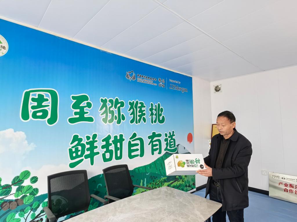周至縣樓觀鎮(zhèn)西樓村黨支部書記楊有民向客商介紹獼猴桃新包裝。新華社記者張斌 攝
