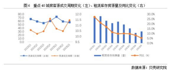 依據(jù)貝殼研究院數(shù)據(jù)監(jiān)測(cè),全國(guó)重點(diǎn)40城2023年三季度房客源成交周期分別為56.7、11.5天,房源成交周期環(huán)比減少2.1天,同比增加2.7天;客源成交周期環(huán)比延長(zhǎng)1天,同比延長(zhǎng)1天。隨著個(gè)人租賃房源供應(yīng)的增加,疊加保障性租賃住房、市場(chǎng)化集中式租賃房源的增加,個(gè)人業(yè)主出租房源出租速度減緩。從庫(kù)存房源來(lái)看,2023年1-9月租賃庫(kù)存房源量均呈現(xiàn)同比增加的趨勢(shì),與此同時(shí),租客租房面臨的選擇項(xiàng)增多,租客對(duì)于租賃房源可選類型和房源量均有增加。