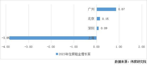 多數(shù)一線城市住房租金微漲,個(gè)別租金下跌。一線城市中,廣州、北京和深圳2023年住房租金分別上漲0.87%、0.15%和0.09%。上海住房租金下跌3.85%。