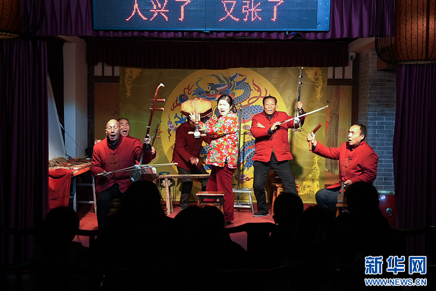 在西安永興坊——陜西非遺文化特色街區(qū),今年69歲的楊啟民(右二)和“華陰市衛(wèi)峪老腔藝術(shù)團(tuán)”的其他老藝人表演國(guó)家級(jí)非遺華陰老腔《關(guān)中古歌》。新華網(wǎng) 楊喜龍 攝