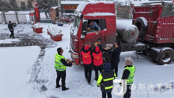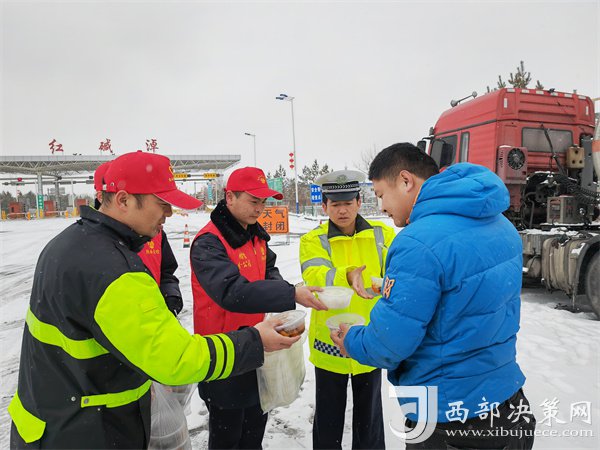 這有小米粥、炸油餅,雞蛋還熱乎著……”榆靖分公司志愿者暖心地喊著話。“行動是最好的破冰劑”,志愿者們?yōu)楦咚贉袈每退腿ナ澄?,頂風冒雪分發(fā)給滯留在收費站的司乘人員。一件件穿梭在寒風中的“紅馬甲”此刻成為了冬日里最美的“志愿紅”,讓群眾在寒意逼人的天氣里感受到了一份特別的溫暖。大家紛紛表示感謝,“熱粥、小菜、松軟的饅頭下肚,全身都熱乎了。”一名滯留司機真誠地感激道。
